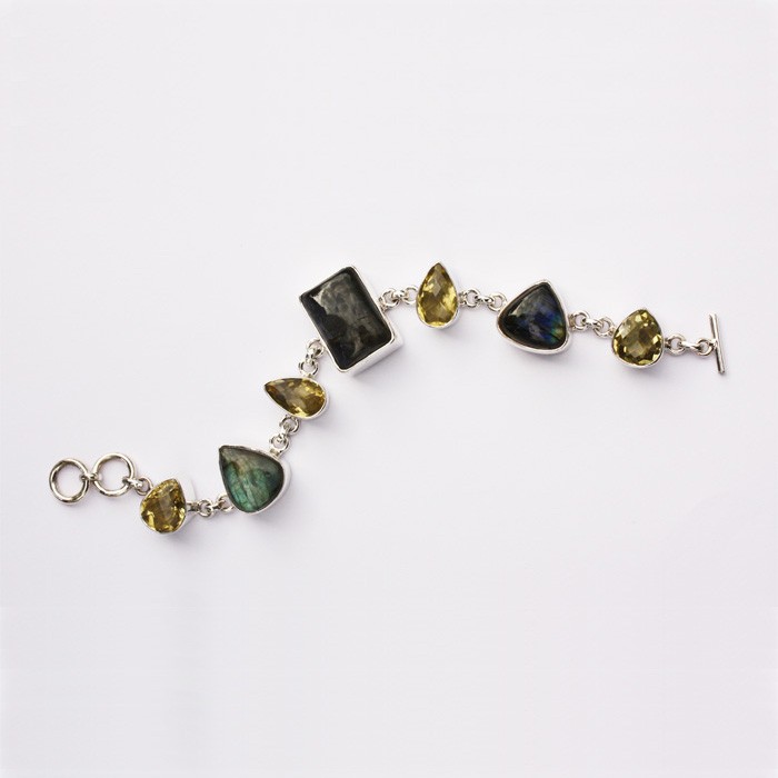 This chunky silver bracelet features Labradorite and Citrine, the colours compliment each other beautifully and it is a great transitional piece! The bracelet has a ‘T’ bar clasp, and can be adjusted to two lengths.